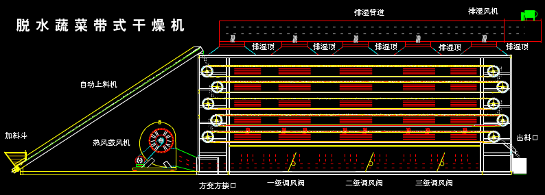 蔬菜脱水干燥机分别有加料器、干燥床、热交换器及排湿风机等主要部件组成。